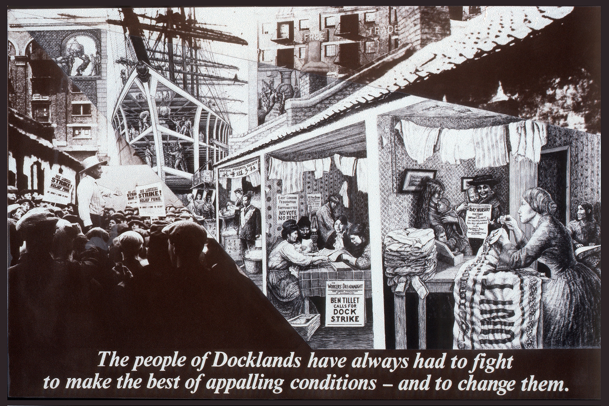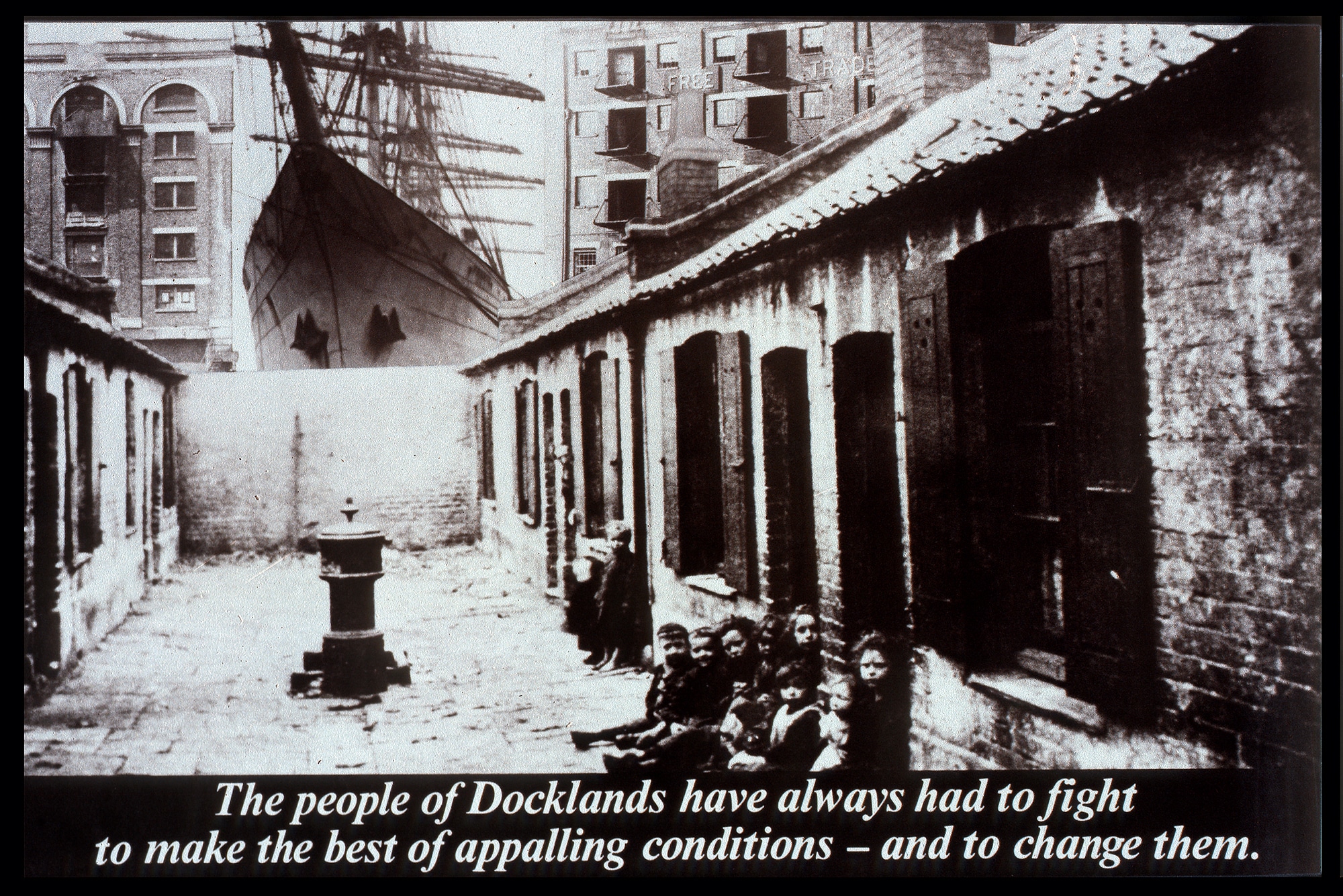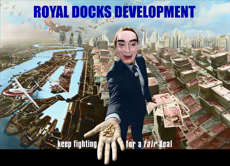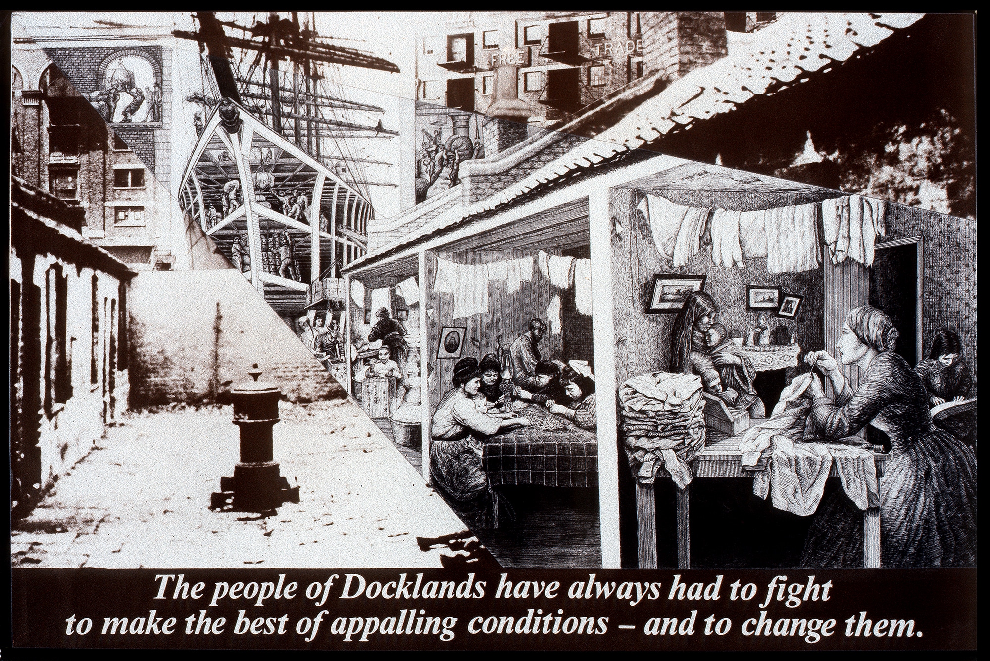 The second photo-mural sequence primarily addressed issues behind the lack of adequate housing for local people, concluding with the urgent issues of developments in Canary Wharf and the Royal Docks.