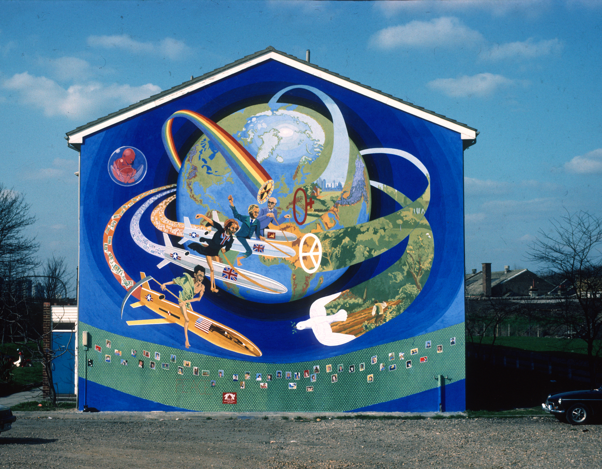 Commissioned  and Funded by:  Greater London Council’s Peace Year, 1984 via the London Muralists for Peace – Brian Barnes, Paul Butler, Pauline Harding, Carol Kenna, Stephen Lobb,  Dale McCrea. Ray Walker .