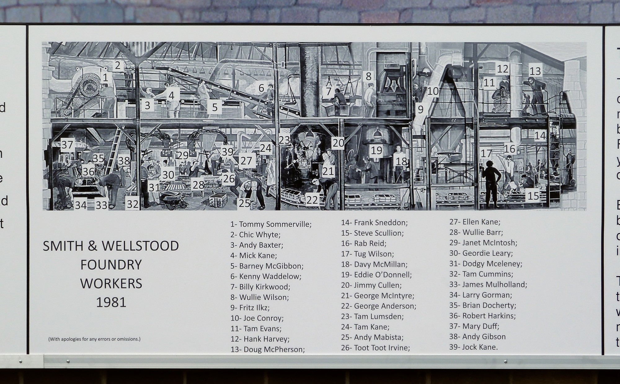 The ‘Restored Mural’ Paul Cortopassi, community researcher and fundraiser in front of the reproduction on Bonnybridge Community Education Centre.